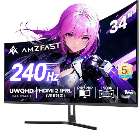 Amzfast 34インチ ゲーミングモニター 240Hz 曲面ウルトラワイド UWQHD 3440X1440 1Ms MPRT 130%Srgb VAパネル 3000:1コントラスト/HDR400/Adaptive Sync/フリッカー防止/PIP PBP機能/ブルーライト低減/HDMI 2.1F